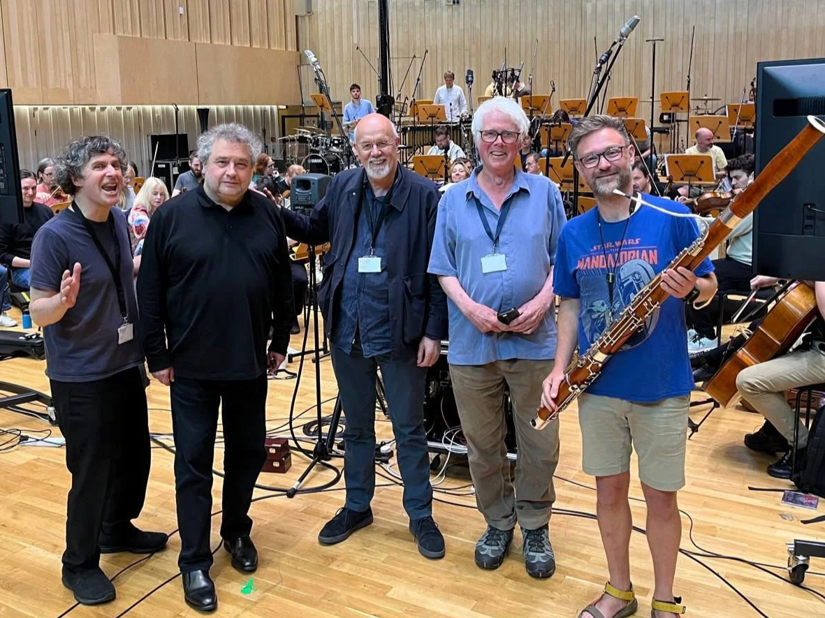 L to R: Robin Stevens, Paul Mann, Me, Michael Ponder (producer) and bassoonist Adam Mackenzie about to play Robin’s Bassoon concerto.